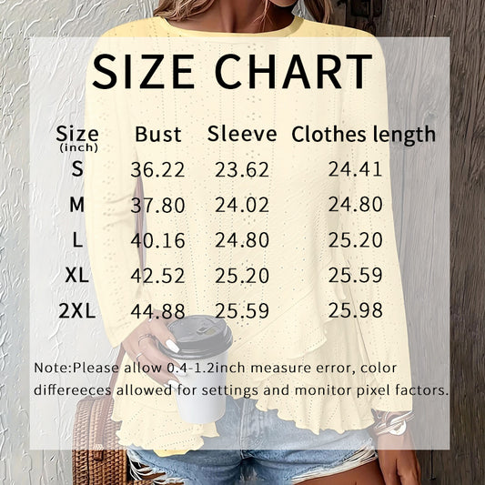 Women Eyelet Long Sleeve Tops Shirts Dressy Casual Crew Neck Ruffle Hem Blouses